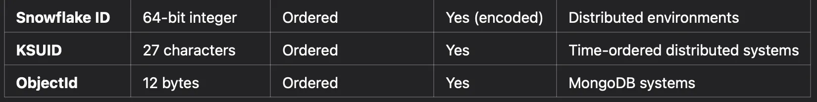 - Distributed Systems: Use UUIDs, CUIDs, or Snowflake IDs.