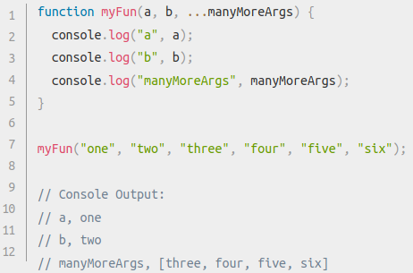 함수의 마지막 파라미터의 앞에 ... 를 붙여 (사용자가 제공한) 모든 나머지 인수를 "표준" 자바스크립트 배열로 대체합니다.