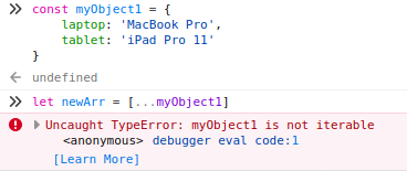 2)객체를 펼쳐서 배열에 넣을 경우 객체는 반복 불가 하기 때문에 Error가 발생.