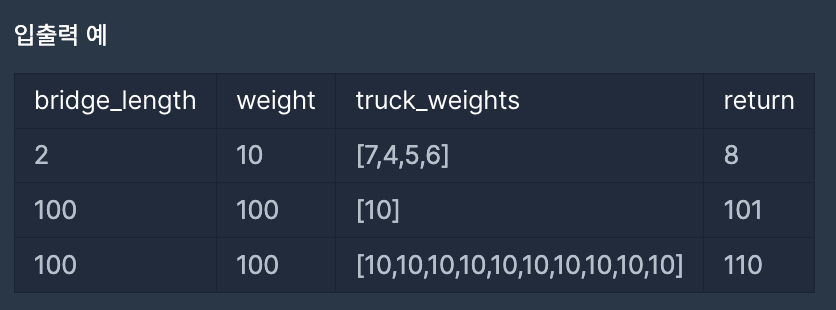 - 다리 길이는 bridge_length로 주어지고, 트럭이 다리를 완전히 건너는 데에는 bridge_length초가 걸린다.
