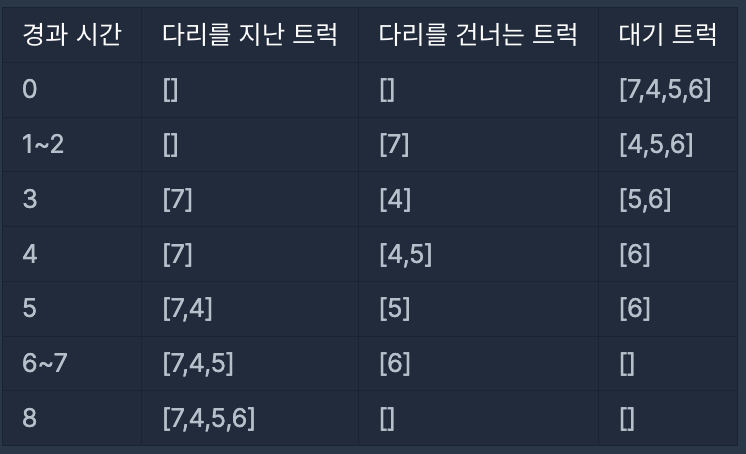 트럭 여러 대가 무게 제한이 있는 다리를 일정 시간 동안 건너는 시뮬레이션 문제다.