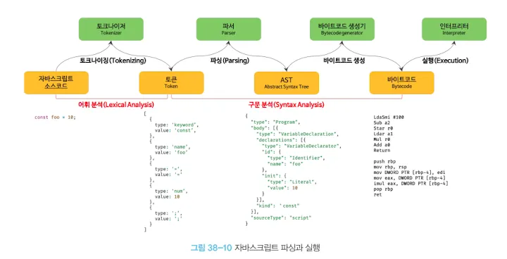 | 토크나이징 (Tokenizing) | 자바스크립트 소스코드를 어휘 분석하여 문법적으로 의미 있는 최소 단위(토큰) 로 분해하는 과정 |