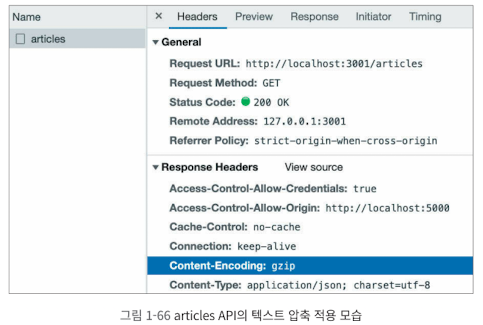 Network 패널 articles API 항목을 확인해 보면, 응답 헤더(Response Headers)에 Content-Encoding: gzip이라고 되어 있는 것을 볼 수 있습니다. 이 리소스가 gzip이라는 방식으로 압축되어 전송되었다는 의미입니다.
