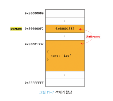 객체(참조) 타입의 값, 즉 객체는 변경 가능한 값이다. 객체를 할당한 변수가 기억하는 메모리 주소를 통해 메모리 공간에 접근하면 참조 값에 접근할 수 있다.