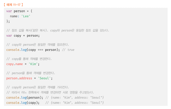 - 원시 값을 변수에 할당하면 변수(확보된 메모리 공간) 에는 실제 값이 저장된다. 이에 비해 객체를 변수에 할당하면 변수(확보된 메모리 공간) 에는 참조 값이 저장된다.