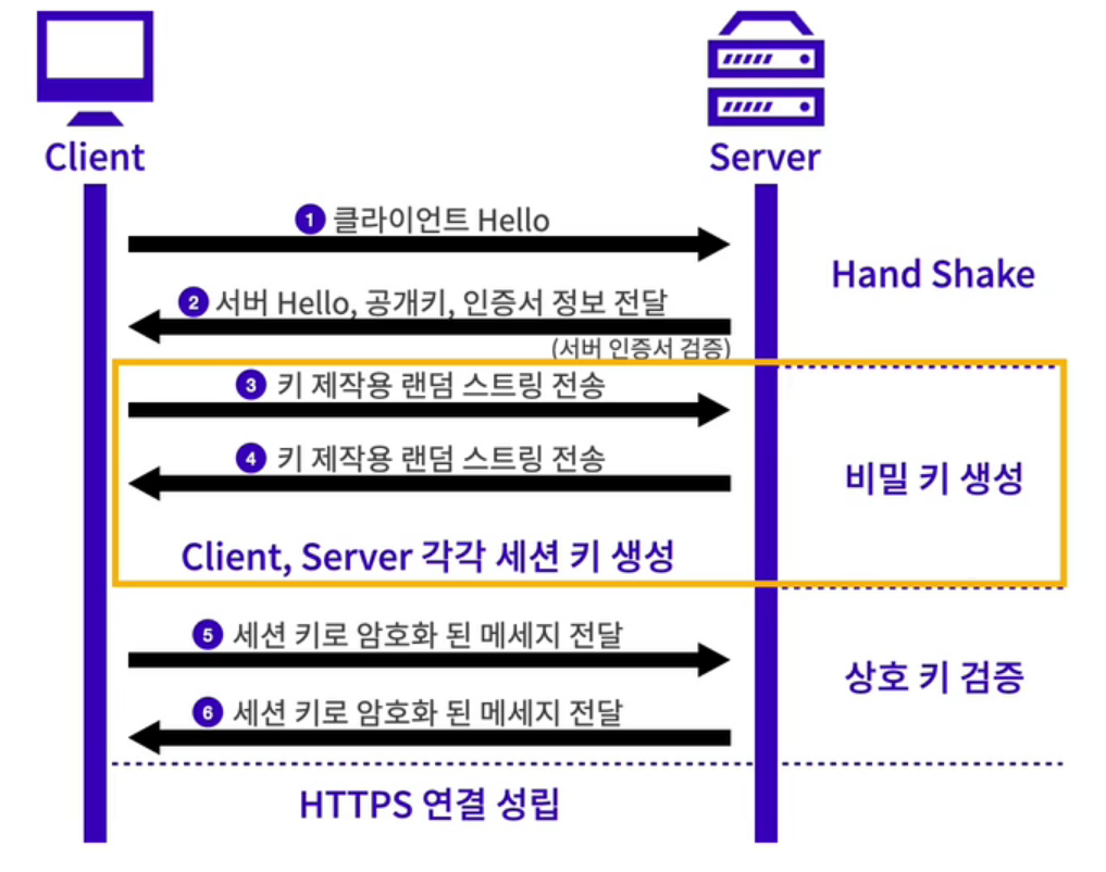 Hand Shake: 클라이언트는 서버로부터 공개키와 인증서 정보를 받는데, 인증서 정보로 인증된 서버인지 확인한다.