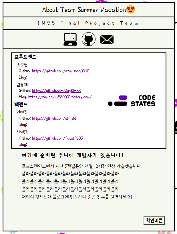 세번째 칸의 첫번째 아이콘을 클릭해도 해당 화면이 나온다. 팀원들과 웹서비스에 대한 소개이다.