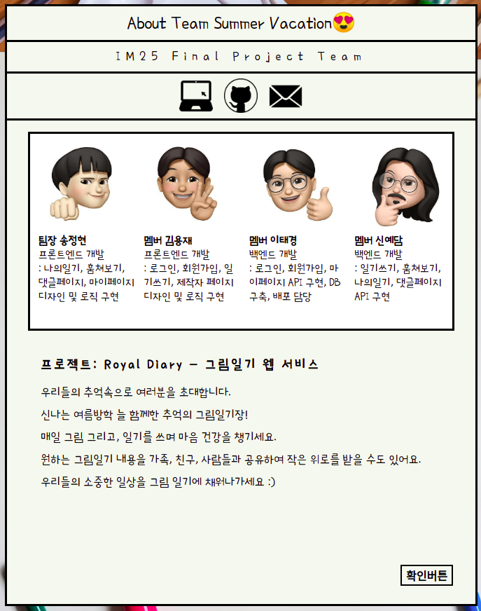개발자 소개페이지를 완성했는데, 팀원 소개는 캐릭터를 적용했다.
