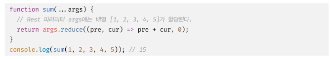 ES6에서는 rest 파라미터를 사용하여 가변 인자 함수의 인수 목록을 배열로 직접 전달받을 수 있다. 이를 통해 유사 배열 객체인 arguments 객체를 배열로 변환하는 번거로움을 피할 수 있다.