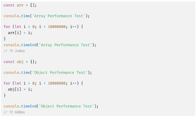 인덱스로 배열 요소에 접근할 때 일반적인 배열보다 느릴 수밖에 없는 구조적인 단점을 보완하기 위해 대부분의 모던 자바스크립트 엔진은 배열을 일반 객체와 구별하여 좀 더 배열처럼 동작하도록 최적화하여 구현했다.