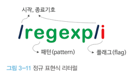 패턴은 /로 열고 닫으며 문자열의 따옴표는 생략한다. 따옴표를 포함하면 따옴표까지도 패턴에 포함되어 검색된다. 또한 패턴은 특별한 의미를 가지는 메타문자meta character 또는 기호로 표현할 수 있다.
