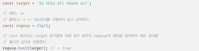 인수로 전달받은 문자열에 대해 정규 표현식의 패턴을 검색하여 매칭 결과를 불리언 값으로 반환한다.