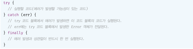 에러를 발생시키려면 try 코드 블록에서 throw 문으로 에러 객체를 던져야 한다.