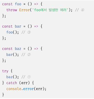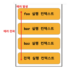 에러는 호출자 방향 즉, 콜 스택의 아래 방향(실행 중인 실행 컨텍스트가 푸시되기 직전에 푸시된 실행 컨텍스트 방향)으로 전파된다.