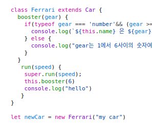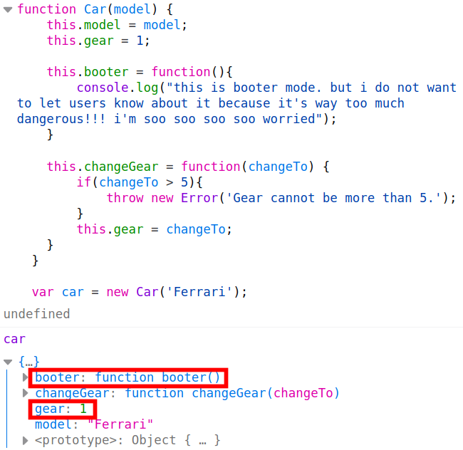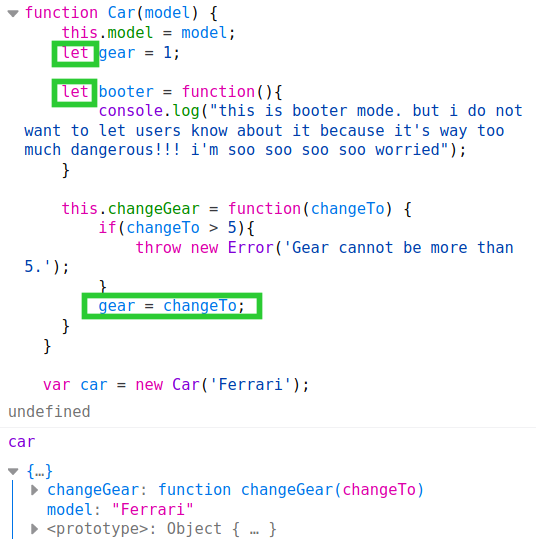 ex) 페라리 생산자는 시스템 안에 있는 복잡한 것들을 최종 사용자에게 노출시켜 걱정을 끼치고 싶지 않다. 특히 몰래 만든 페라리의 부스터 기능을 숨기고 싶다. 노출시키고 싶지 않은 객체 멤버의 경우엔 this 키워드가 아닌 var, const, let 키워드를 사용하여 클래스의 메소드 내에서 해당 키워드에 접근시킬 수 있다.