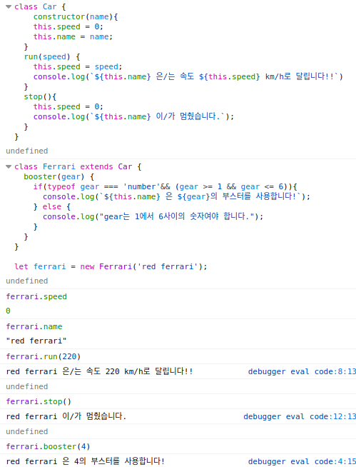 Ferrari 에서 run(), stop() 등의 메소드를 자체 정의하면, 상속받은 메소드가 아닌 Ferrari 자체의 메소드를 사용합니다.